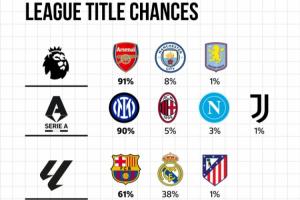 体育资讯02月03日讯 根据EuroClubIndex的预测数据,五大联赛最新夺冠概率如下。