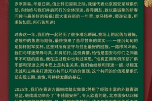 岁序常易,华章日新。值此辞旧迎新之际,我谨代表北京国安足球俱乐部,向始终与我们并肩同行的全体球迷、各界朋友,致以最诚挚的新春问候与最美好的祝福!愿大家在新的一年里,龙马精神,顺遂安康,所求皆如愿,所行皆坦途!