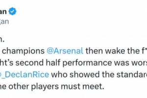 摩根写道:“表现不够好。若想成为冠军,阿森纳就他X赶紧醒醒吧,别等到为时已晚。昨晚下半场的表现是我多年来见过的最糟糕的。唯独赖斯值得宽容——他展现的拼劲和强度正是其他球员必须达到的标准。”