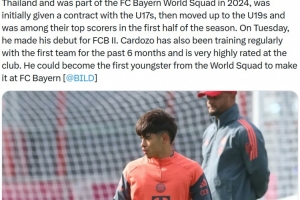 报道称这位在泰国长大的巴西小将曾在2024年入选拜仁世界队。最初他与U17梯队签约,随后升入U19梯队,并在赛季前半段成为该队的主要得分手之一。本周二他首次代表拜仁二队出场。在过去六个月里,卡尔多佐还经常与一线队一起训练,并在俱乐部中备受好评。他有望成为首位从世界队脱颖而出并成功进入拜仁一线队的年轻球员。