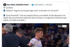 巴尔达诺问安切洛蒂是否遇到过阿隆索和维尼修斯那样的事,安帅表示:“有一次我把克罗斯换下,他生气了。第二天我没跟他说话。出场前我们碰到了,我问他要不要聊聊,他说‘这事翻篇了’”