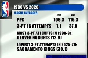 2025-26赛季,联盟场均得到115.3分,场均三分出手37.0次,最多三分出手的球队是国王场均30.1次