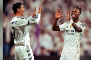 维尼修斯社媒转发433制作的他与C罗的同框图片,配文:“偶像。”