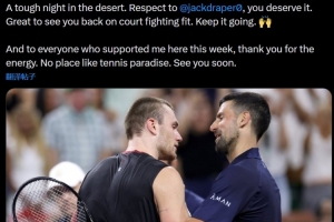 德约科维奇写道:“在沙漠中度过了一个艰难的夜晚。向杰克·德雷珀表示敬意,这是你应得的胜利。很高兴看到你重返赛场,重拾强健的竞技状态。继续加油。”